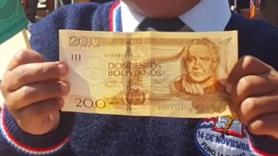 El Bono Juancito Pinto, de 200 bolivianos, tiene el objetivo de disminuir la tasa de deserción escolar, incentivando la matriculación, permanencia y culminación del año educativo de los estudiantes.