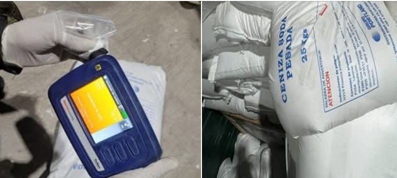 En el momento se dio inicio al desprecintado del tracto-camión encontrando en su interior en la parte posterior de la carrocería, bolsas de yute de color blanco con la leyenda “CENIZA DE SODA” que al realizar la prueba de campo con el equipo electrónico TRU-NARC dio como resultado positivo (+) para CARBONATO DE SODIO, procediendo al secuestro de 170 bolsas de yute color blanco conteniendo CARBONATO DE SODIO, CON UN PESO DE 24.5 KG. APROXOXIMANDAMENTE.