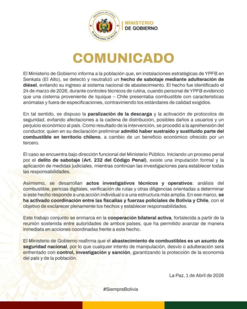 El Ministerio de Gobierno remarcó que el abastecimiento de combustibles es un asunto de seguridad nacional, por lo que cualquier intento de manipulación será enfrentado con control, investigación y sanción.